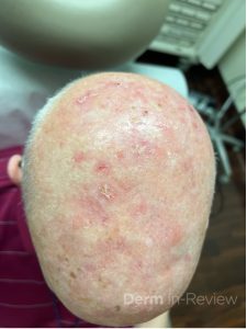 A 60-year-old male presents to your clinic for a skin cancer screening. He has no history of skin cancer or skin cancer treatments, but does admit to a heavy sun exposure history. You identify the pictured scalp lesions during your exam (Figure 1). Given the extent of scalp involvement, you prescribe a topical field therapy. A few days after beginning treatment, he develops rapidly progressive erythema, edema, erosions, and ulceration at the application sites, accompanied by fever, nausea, vomiting, and diarrhea.