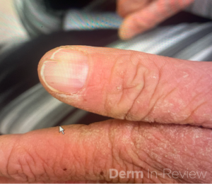 This patient has scabies confirmed by positive mineral oil prep. Scabies is caused by infestation with the mite Sarcoptes scabiei and presents with intensely itchy papules, nodules, and burrows, often worsening at night. Scabies is highly contagious via skin-to-skin contact and fomites.1,2 Scabetic nodules on the trunk, axillae and genitalia are the most common presentation in infants and can remain for several months after resolution.3