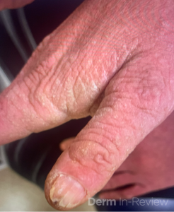 A 30-year-old female with a past medical history of major depressive disorder presented with a severe flare of a lifelong, intermittent dermatitis that had been ongoing for 3 weeks. The flare started after completing a twelve-day prednisone taper and was unresponsive to daily application of fluocinonide 0.05% cream. Throughout the lifelong management of her condition, she had previously failed management with other high-potency topical steroids, topical calcineurin inhibitors, and intramuscular corticosteroids. Family history was pertinent for similar symptoms in her identical twin sister. On examination, the patient was uncomfortable appearing and was diffusely erythrodermic with pink plaques with thick, desquamative scale distributed on the trunk and extremities (Figures 1 and 2).