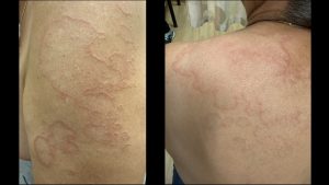 Dermatomyositis (DM) is an idiopathic inflammatory myopathy characterized by progressive, symmetric, proximal muscle weakness and an array of distinct cutaneous manifestations. Classic skin findings include a heliotrope rash, periorbital edema, red or violet papules overlying the bony prominences on the dorsal hands and other joints, such as the elbows and knees (Gottron papules), red-purple rash on the upper chest (V-sign), upper back, shoulders, and neck (shawl sign), or on the lateral hips and upper thighs (holster sign), and characteristic nail findings.1,2
